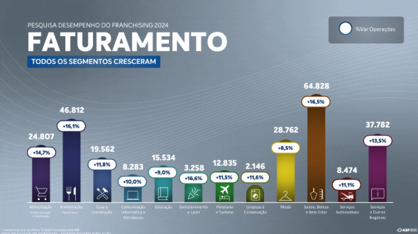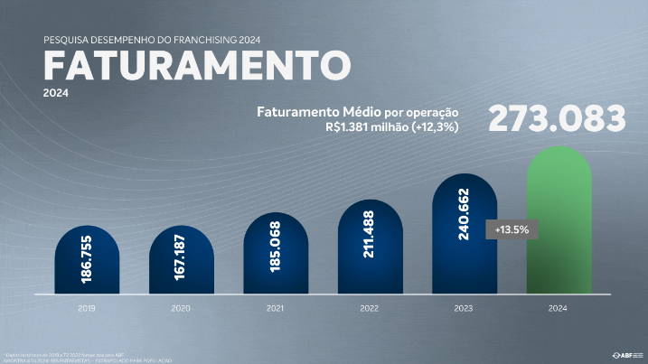 A Pesquisa de Desempenho do Franchising Brasileiro 2024 teve uma base amostral que representa, aproximadamente, 29% do faturamento do setor. Envolvendo o mercado como um todo, inclusive não associados, os números do desempenho do setor de franchising são apurados em pesquisa por amostragem extrapolados para o mercado, cruzados com levantamentos feitos por entidades representantes de setores correlatos ao sistema de franquias, órgãos de governo, instituições parceiras e de ensino. Auditados por empresa independente, os dados divulgados pela ABF são referência para órgãos governamentais de diversas esferas, entidades internacionais do franchising, como World Franchise Council (WFC), Federação Ibero-americana de Franquias (FIAF) e instituições financeiras.