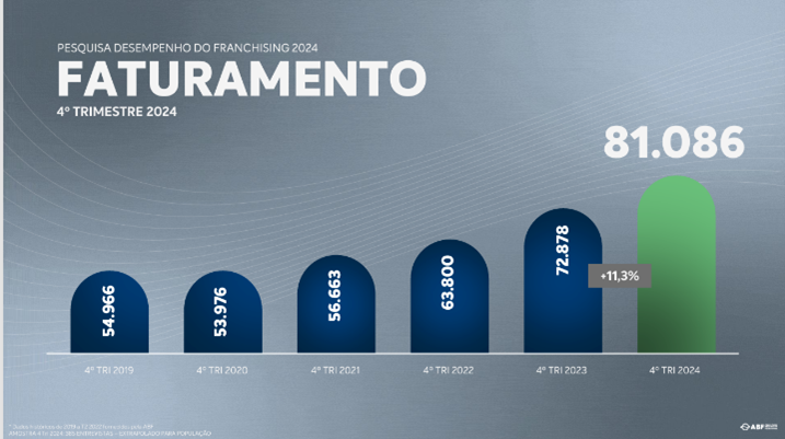 - No 4º trimestre, franchising cresce 11,3%, superando R$ 81 bilhões de faturamento.