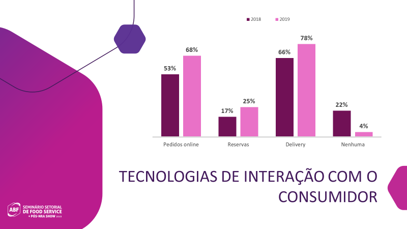 De acordo com o levantamento, 78% das marcas pesquisadas pretendem investir em tecnologias de serviços delivery em 2019 ante 66% no ano passado. Os pedidos online vêm a seguir, com 68% das projeções de investimento contra 53% no mesmo período.