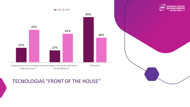 Outro dado relevante do estudo é a tendência de aumento dos investimentos em tecnologias “front of the house” (à frente do balcão). Entre as marcas respondentes, 47% planejam investir em equipamentos de tecnologia como iPads para menu em 2019. No ano passado, 21% haviam investido. Quiosques e terminais eletrônicos de atendimento vêm em segundo lugar. Enquanto 17% das redes pesquisadas destinaram recursos para estes itens em 2018, 41% delas pretendem fazer o mesmo este ano.