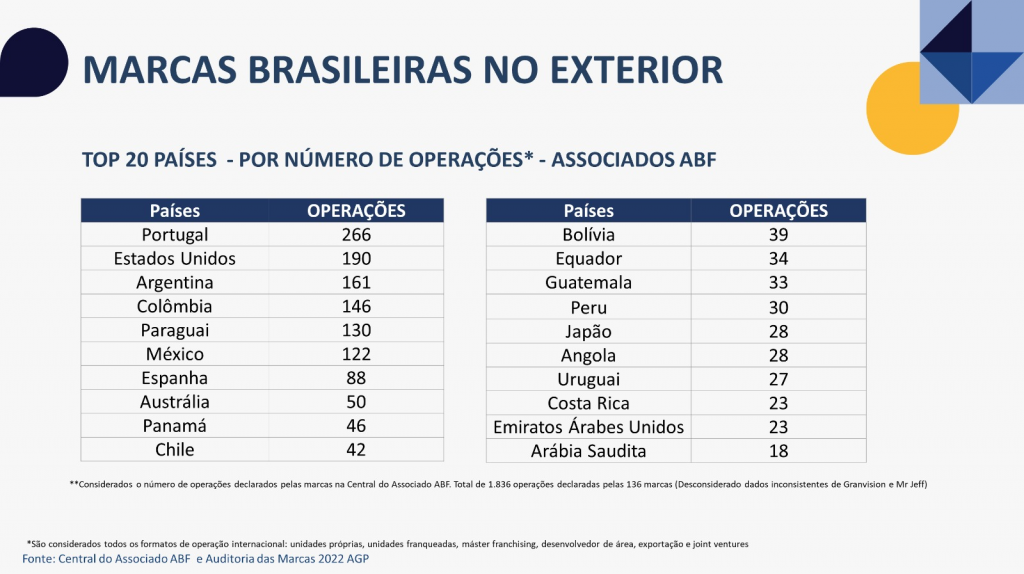 Para Tom Moreira Leite, presidente da ABF, “a forte retomada do mercado de franquias no Brasil, com um crescimento de mais de 14% em 2022, também se traduziu em um interesse renovado pela internacionalização. Dentro desse movimento, temos vários perfis: redes que estão retomando planos pré-pandemia, planos de expansão que amadureceram nos últimos anos e chegaram à fase de internacionalização e redes que estão começando essa jornada. De qualquer maneira, a internacionalização é um caminho importante para ganhos de escala e para consolidar marcas em nível global”.