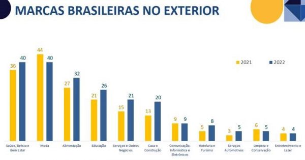 O levantamento indica que o segmento de Moda continua liderando a lista por número de marcas, porém diminuiu a sua participação, de 44 para 40, empatando com Saúde, Beleza e Bem-Estar, que em 2021 contava com 36 redes no exterior. Alimentação, que subiu de 27 para 32 marcas, Educação, de 21 para 26, Serviços e Outros Negócios, de 15 para 21, e Casa e Construção, de 13 para 20, apresentaram crescimentos mais expressivos.