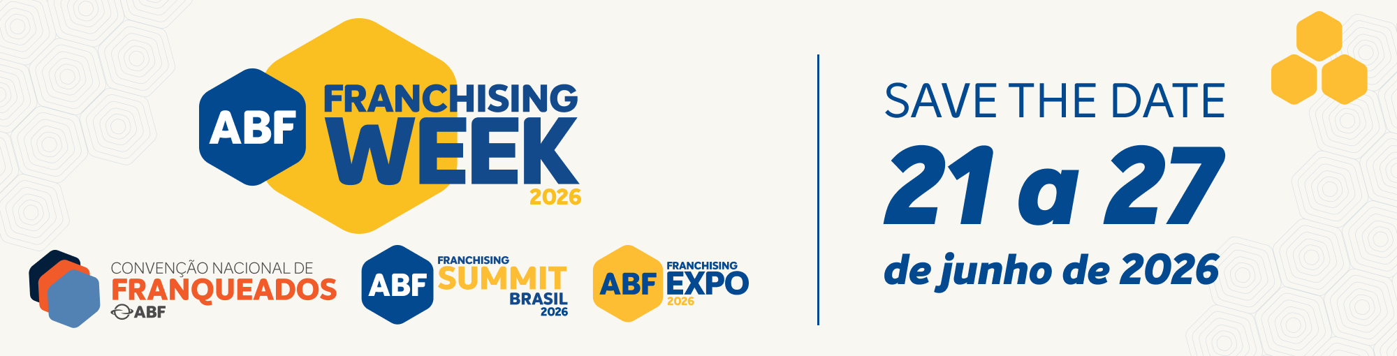 A ABF Franchising Week é a principal semana de imersão no universo das franquias, reunindo conteúdo, relacionamento e oportunidades de negócio. A Convenção Nacional de Franqueados coloca o franqueado no centro do setor, a ABF Franchising Summit Brasil concentra a agenda de conhecimento estratégico e a ABF Franchising Expo conecta marcas e investidores, gerando oportunidades de expansão.