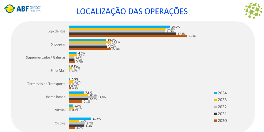 O estudo da ABF apontou, ainda, que, a exemplo do primeiro trimestre de 2023 comparado ao mesmo período anterior, na distribuição das operações por localização continua o predomínio das operações de franquias em ruas, que passaram de 52,0% para 54,2%. As operações em shopping centers também se mantiveram na segunda posição, com uma redução de 22,2% para 19,8% (embora em termos absolutos tenha crescido).