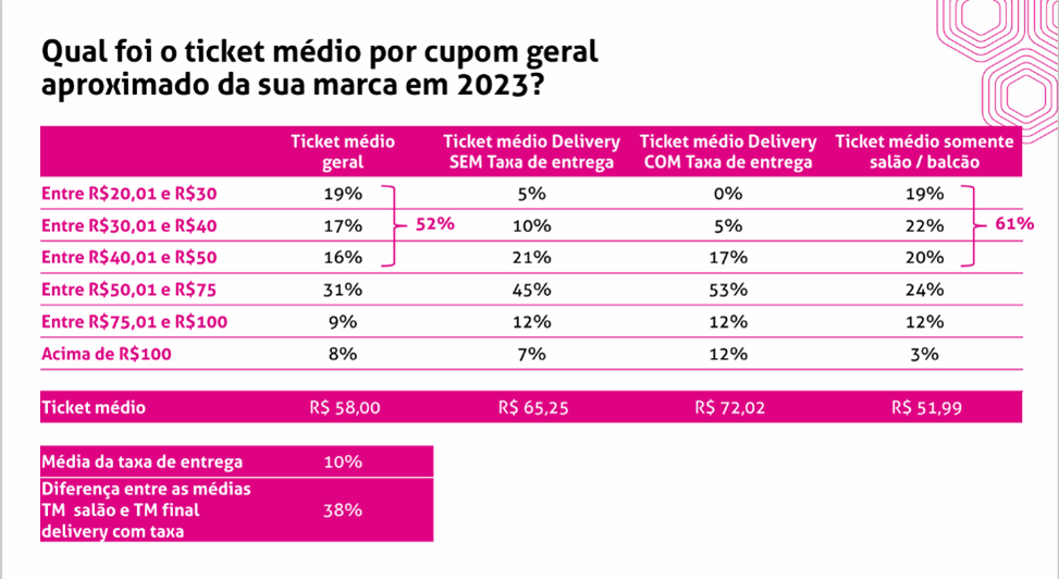 Graças à diversidade dos tipos de negócio de alimentação no franchising, há uma variação no ticket médio de acordo com o tipo de compra efetuada. 52% têm ticket médio geral entre R$ 20 e R$ 50 e 62% no ticket médio somente salão/balcão no mesmo intervalo. Já no delivery sem taxa de entrega, 59% têm ticket médio entre R$ 50 e R$ 100 (77% com taxa).