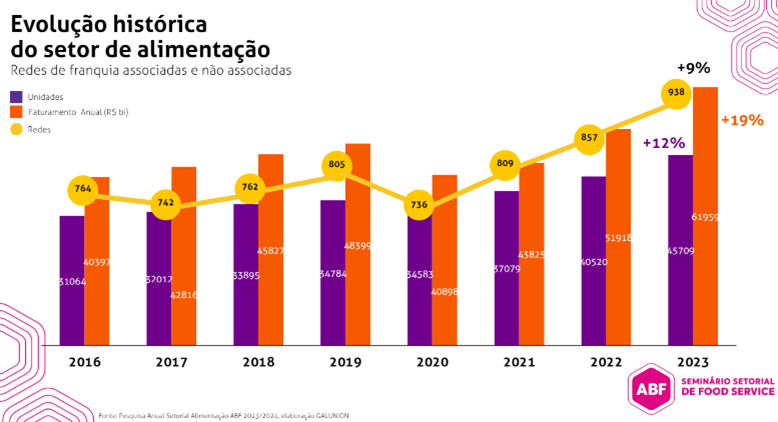 Com o aumento da presença de consumidores nos estabelecimentos de alimentação, de forma presencial, mais a facilidade do delivery, que é uma plataforma que veio para ficar, o segmento de Alimentação (tanto Foodservice quanto Comércio e Distribuição) fechou 2023 com crescimento de 19% no faturamento, com R$ 61,959 bilhões, além de um aumento de 12% no número de unidades, que passou de 40.520 operações para 45.709. O número de redes também registrou um incremento de 9%, passando de 857 para 938. Essa parcela do franchising repetiu a dose no 1º trimestre de 2024, com Alimentação – Comércio e Distribuição crescendo 43,9% (com impacto da Páscoa no 1º trimestre e excelente desempenho das chocolaterias) e Alimentação Food Service crescendo 26,6%.