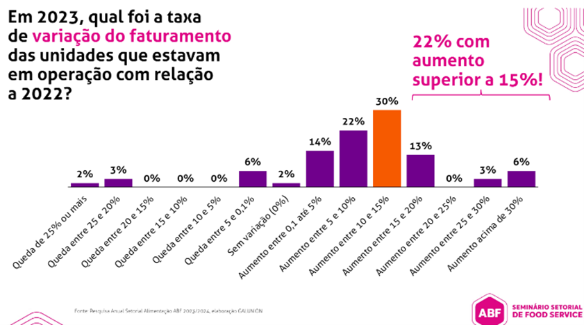 Levando em conta dados que englobam a performance do segmento, 88% dos respondentes tiveram aumento das vendas em 2023, comparando com 2022. Entretanto, bem acima do mercado, 22% dos entrevistados registraram um crescimento superior a 15% no faturamento anual. Em relação aos lucros, 97% das empresas tiveram aumento na receita no ano passado, sendo que apenas 16% obtiveram um percentual acima de 15%. “Por meio destes números, vemos que o setor de foodservice é saudável e apresenta bons resultados, apesar dos desafios que englobam a inflação, o aumento de custos e impostos. Em grande parte dos casos, as marcas não conseguem diluir esse montante e repassar ao consumidor, trabalhando com margens apertadas. Apesar do cenário, o segmento de alimentação segue com um faturamento positivo, mostrando a força no franchising e a importância do sistema de delivery, que proporciona um valor agregado aos negócios, tendo uma participação representativa nas vendas em diferentes tipos de culinária”, ressalta Tom Moreira Leite, presidente da ABF.
