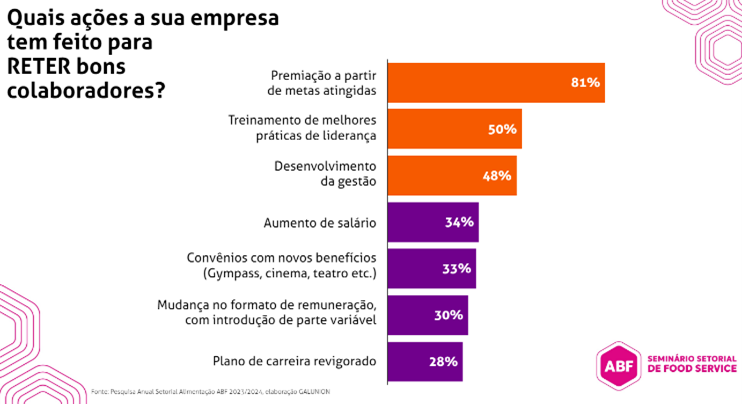 - Segmento se destaca na geração de vagas, incluindo de 1º emprego, com 81% das empresas investindo em premiações a partir de metas atingidas, 50% em treinamentos de melhores práticas de liderança e 48% no desenvolvimento de gestão