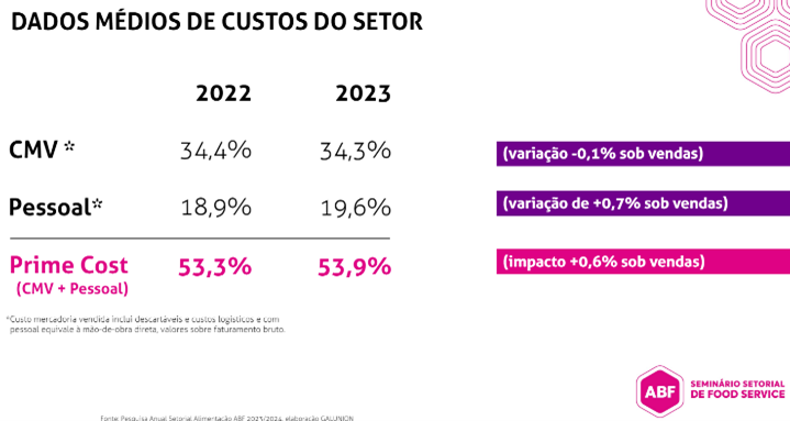 Ainda tratando sobre custos, os dados mostram que as empresas continuaram sendo pressionadas de 2022 para 2023. O CMV (Custo de Mercadoria Vendida), que inclui descartáveis, custos logísticos e mão-de-obra direta, com base em valores sob faturamento bruto, passou de 34,4% em 2022 para 34,3% em 2023, praticamente se mantendo estável, com pequena variação de 0,1% sob as vendas. Já no pessoal passou de 18,9% em 2022 para 19,6% em 2023, uma variação maior, de 0,7% sob vendas. Já os custos de ocupação sob o faturamento bruto são de 16% para shoppings, 10% para pontos nas ruas e 13% para galerias e outros locais.