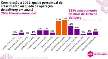 Mostrando a importância e força desse canal de atendimento, que se tornou um hábito de consumo regular na vida dos brasileiros, o delivery é utilizado por 95% das redes entrevistadas, representando 31% do faturamento para quem adota este mecanismo. Neste levantamento, 57% das marcas ouvidas utilizam aplicativos próprios e de terceiro para o delivery, enquanto 43% usam apenas plataformas de terceiros para efetuarem as entregas. Com o iFood sendo a alternativa mais buscada para vendas por 100% dos negócios, outros canais como WhatsApp com 52%, aplicativo e próprio site com 41%, Rappi com 40% e Telefone com 34% também figuram na pesquisa. No comparativo sobre o crescimento no faturamento do delivery de 2022 para 2023, 76% tiverem um aumento, sendo que em 33% das redes o crescimento foi de mais de 10% neste canal.