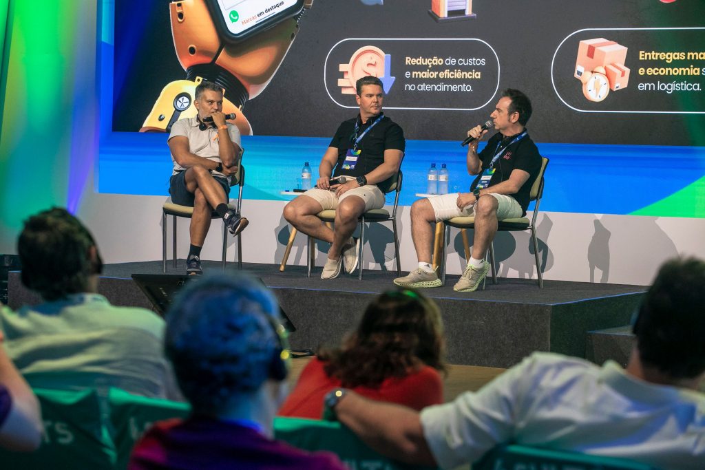 À tarde, os congressistas puderam assistir ao “Talk: IA no varejo”, reunindo Marcio Kumruian (Netshoes, Pecaai e Ziyou), Gustavo Freitas (Mercadão dos Óculos) e o moderador Daniel Zanco (Central do Varejo).