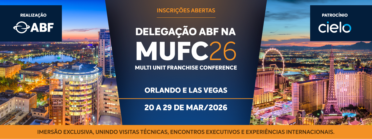 A ABF já abriu as inscrições para a Delegação ABF na Multi-Unit Franchise Conference 2026 (MUFC), a maior e mais relevante feira de multifranqueados do mundo, e você não pode ficar fora dessa! Entre 20 e 29 de março, os participantes viverão uma imersão internacional exclusiva em Orlando e Las Vegas, unindo visitas técnicas, encontros executivos e uma programação aprofundada sobre expansão, gestão e tendências do franchising global.